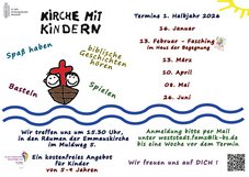 Aktuelle Termine und Uhrzeiten der Gruppen und Kreise für Kinder und Familien sind auf den gelben Wochenplänen zu finden. Diese sind in allen Schaukästen der Kirchengemeinde ausgehängt